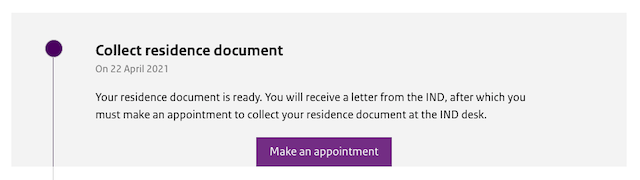 การขอรับบัตรอนุญาตผู้พำนักอาศัยสามารถทำได้หลังจากที่ได้รับจดหมายแจ้งจาก IND ในบางกรณีก็สามารถทำได้ก่อนที่จะได้รับจดหมายฉบับจริง โดยเข้าไปตรวจสอบสถานะเอกสารได้ที่เว็บไซต์ของ IND ถ้ามีการออกบัตรอนุญาตผู้พำนักอาศัยแล้ว สถานะในระบบจะเปลี่ยนเป็น Collect residence document (ดูรูปภาพถัดไปประกอบ) จากนั้นสามารถนัดหมายออนไลน์ในระบบโดยกดปุ่มสีม่วงที่มีคำว่า Make an appointment (แนะนำให้ทำไว้เลยเนื่องจากคิวค่อนข้างเยอะ)
